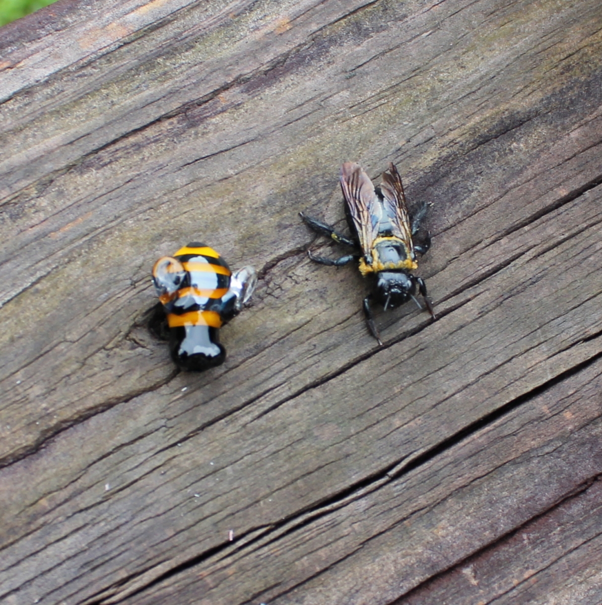 A real, live, non glass bumble bee had landed on the deck railing and was about to get cozy with my creation. I let them get to know each other before I collected the non stinging one and placed him gingerly on my big pile of hard work.