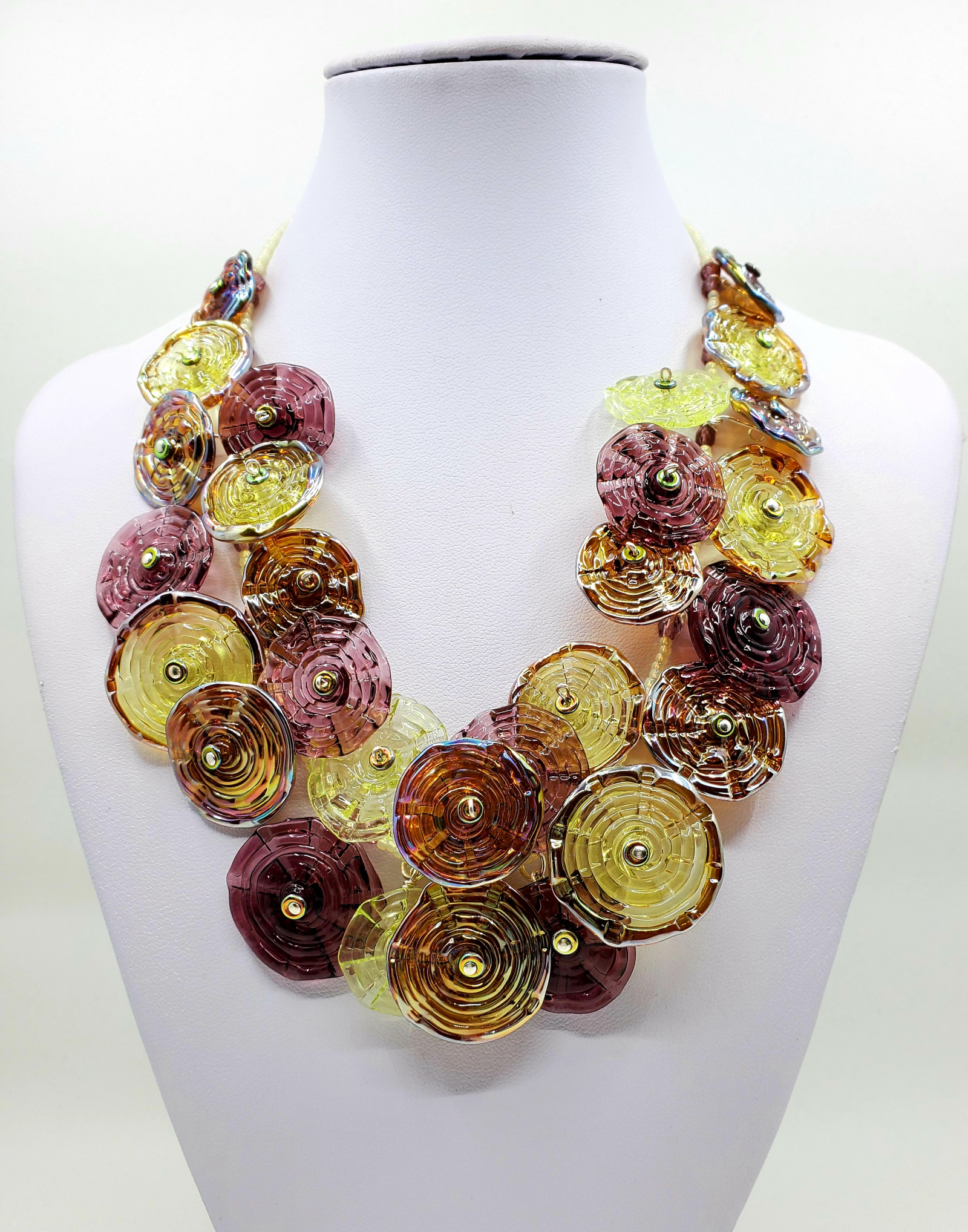 29 beads in tones of greenish yellow and amethyst with the real star being an amber glass that changes color with the light. Just the right amount.