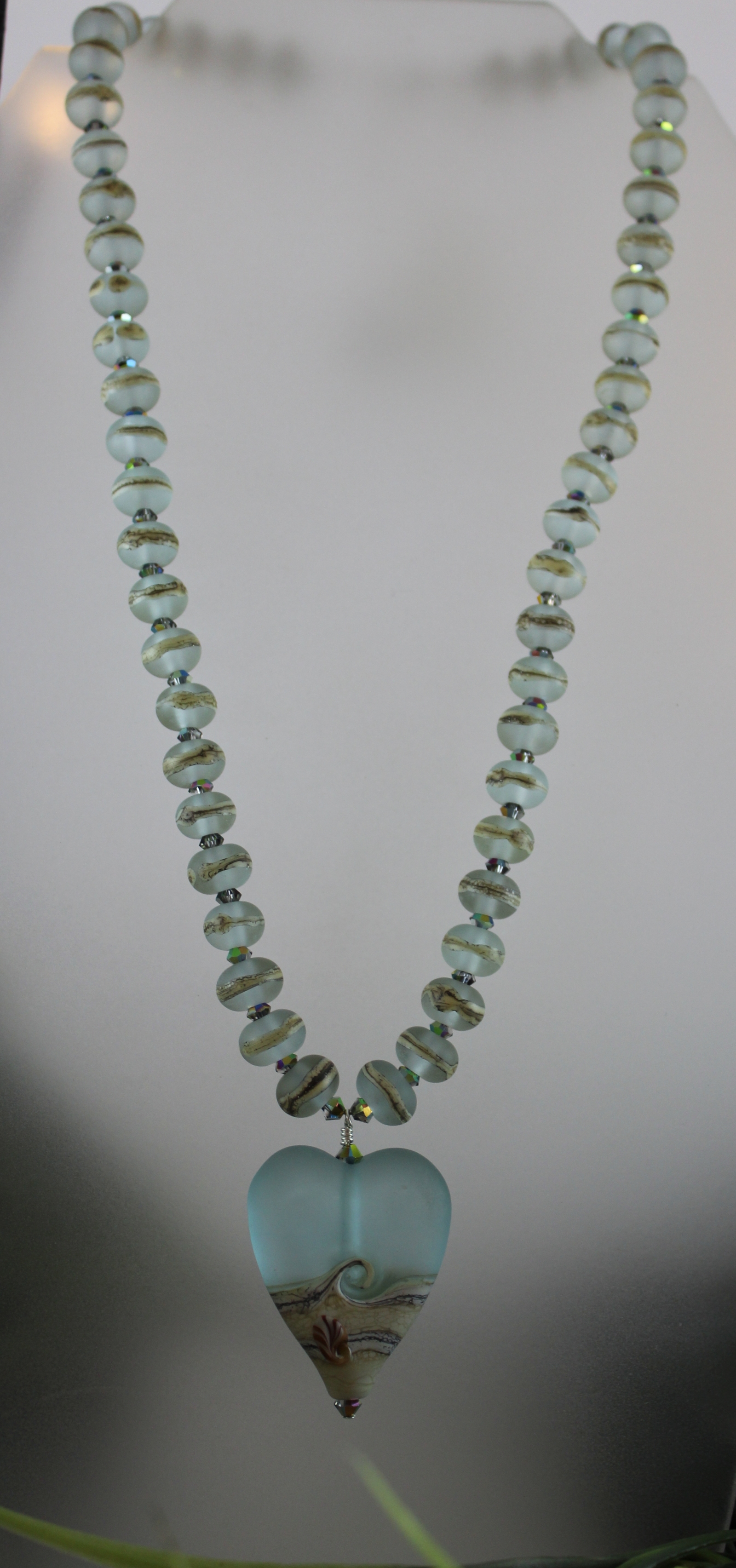 Light Aqua and Ivory glass softly etched to mimic sea glass, this statement necklace will help you remember where you left YOUR heart too.