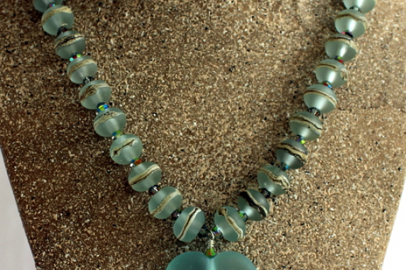 Light Aqua and Ivory glass softly etched to mimic sea glass, this statement necklace will help you remember where you left YOUR heart too.